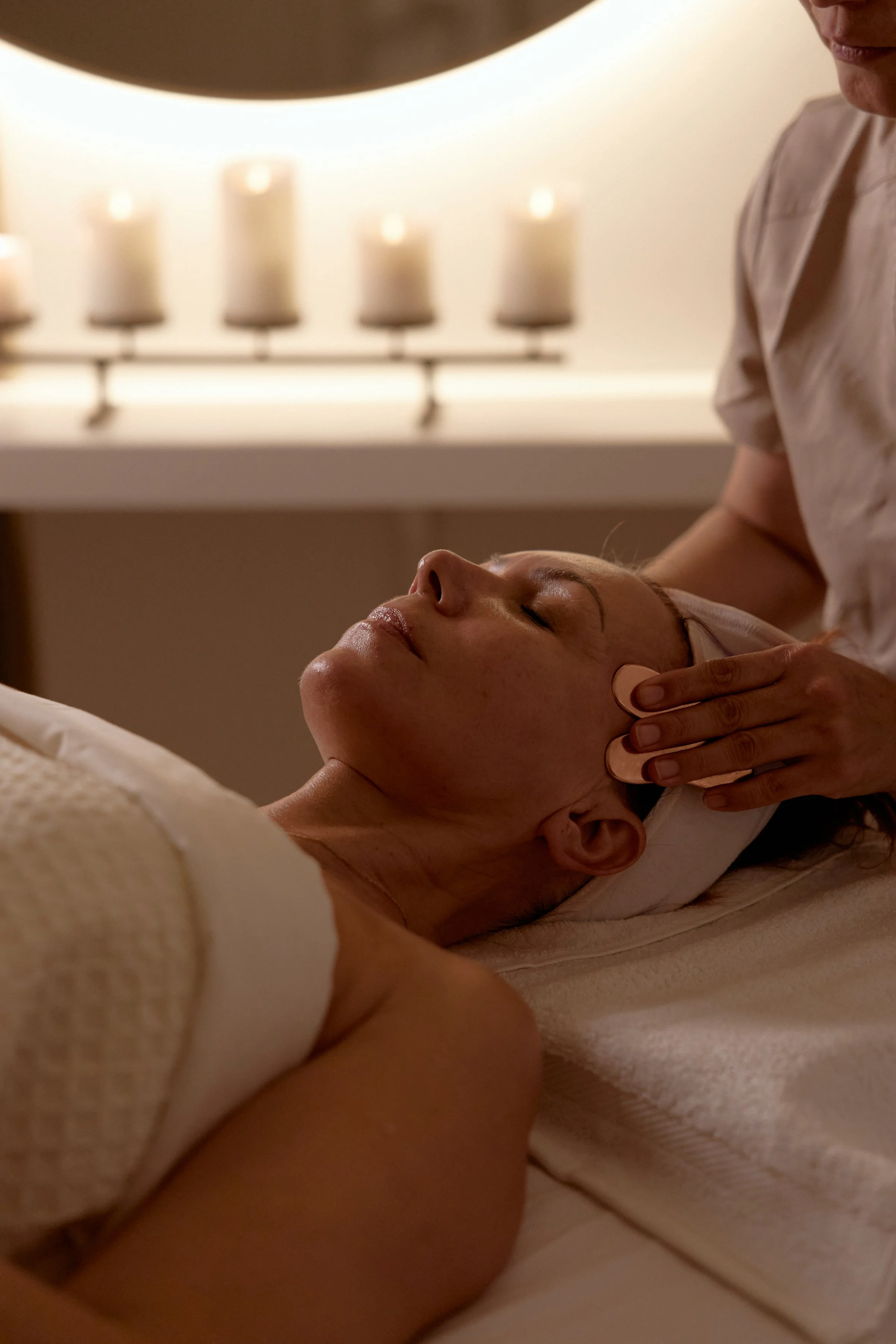 Oriental energy flow facial massage using GuaSha and cupping to lift, tone, and sculpt. Enhances lymphatic drainage, improves skin texture, and promotes a naturally firm, radiant, and youthful glow.